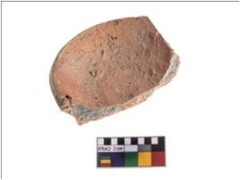 | Description / विवरण | A partially broken specimen of a terracotta lamp, circular on plan, with triangular rim and circular base which shows a clear string mark where it has been cut from the potter s wheel. It is made of red ware, fine fabric, well-fired. |