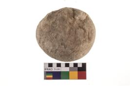 | Description / विवरण | A partially broken specimen of roughly round shaped hammer stone with battered periphery along with the circumference. |