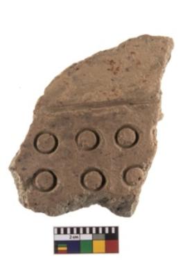 | Description / विवरण | A sherd of red slipped ware with corrugated shoulder. A pattern of small impressed circles pierced in the centre by sharp point. |