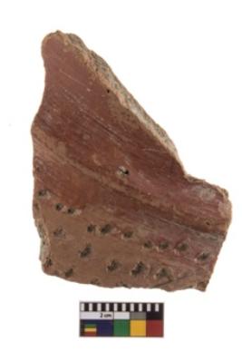 | Description / विवरण | A red slip sherd having a design of irregular piercings. |