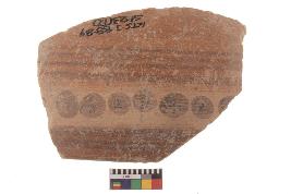 | Description / विवरण | Specimen of black on red ware with black decorative Circles between lines geometric painting. |