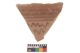 | Description / विवरण | Specimen of black on red ware with black decorative Parallel wavy lines between lines geometric painting. |