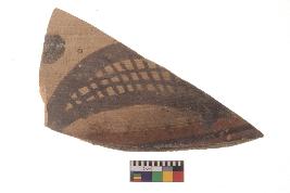 | Description / विवरण | Specimen of black on red ware with black decorative Joint lattice curves with circles on joint geometric painting. |