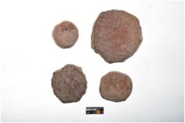 | Description / विवरण | There are n-4 plain pottery discs without perforation. Their colour varies from dark to light red. These discs have eroded edges. |