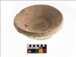 | Description / विवरण | A complete specimen of a terracotta lamp, circular on plan, with triangular rim, thick walls and circular-flat-hollow base which shows a clear string mark where it has been cut from the potter s wheel. It is made of red ware, fine fabric, well-fired. |