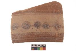 | Description / विवरण | Specimen of black on red ware with black decorative Circles between lines geometric painting. |
