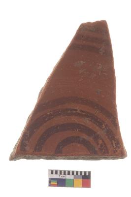 | Description / विवरण | Specimen of red ware with decorative geometric circle Pattern painting. |