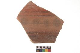 | Description / विवरण | Specimen of black on red ware with black decorative Circles between lines geometric painting. |
