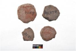 | Description / विवरण | There are n-4 plain pottery discs without perforation. Their colour varies from dark to light red. These discs have eroded edges. |