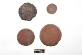 | Description / विवरण | There are n-4 plain pottery discs without perforation. Their colour varies from dark to light red. These discs have eroded edges. |