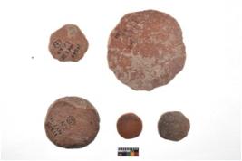 | Description / विवरण | There are n-5 plain pottery discs without perforation. Their colour varies from dark to light red. These discs have eroded edges. |