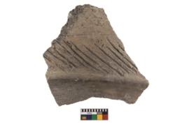| Description / विवरण | Fragment of a partially burnished grey ware with a ridge.Above the ridge slanting lines hae been incised. |