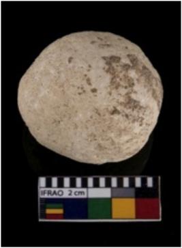 | Description / विवरण | A complete specimen of round quartz sling ball, medium in size, and with rough surface. |