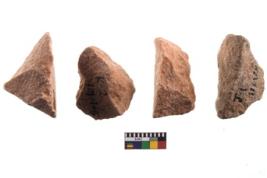 | Description / विवरण | Specimen of flake tools with prominent flaking marks. Made up of a short flakes with sides trimmed. |