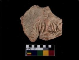 | Description / विवरण | A partially broken specimen of terracotta seal impression. It is almost globular, it bears the imprint of a circular seal, with the floral design on it. It is having well formed handle at the top to provide a firm grip. It is made of red ware, fine fabric, smooth texture and well fired. |