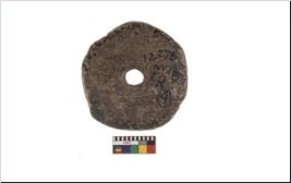 | Description / विवरण | A plain pottery disc with perforation.It is reddish in colour and decorated with black wavy lines. It has eroded edges. |