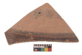 | Description / विवरण | Specimen of black on red ware with black decorative Circles between lines geometric painting. |