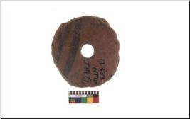 | Description / विवरण | A plain pottery disc with perforation.It is reddish in colour and decorated with black lines. It has eroded edges. |