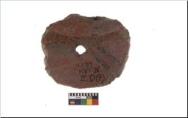 | Description / विवरण | A plain pottery disc with perforation.It is reddish in colour and decorated with black lines. It has eroded edges. |