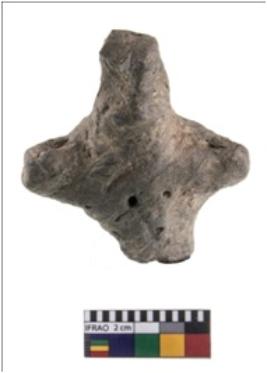 | Description / विवरण | A partially broken handmade specimen of a medium sized crude terracotta female torso with flattened head and the features made by pinching. The head is perched on a thick bull neck, which slopes into the arms that are denoted by outthruststumps. The arms continue into a narrow waist at which point the figurine is broken. three small impressed dots denote the nipples and navel. It is greyish in colour. |