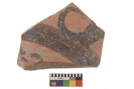 | Description / विवरण | Specimen of black on red ware with black decorative Joint circles between lines geometric painting. |