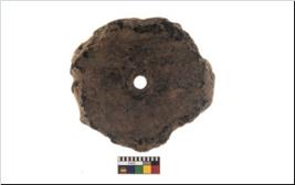 | Description / विवरण | A plain pottery disc with perforation.It is reddish in colour. It has eroded edges. |