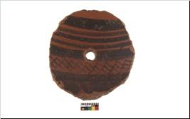| Description / विवरण | A plain pottery disc with perforation.It is reddish in colour and decorated with lines and check pattern. It has eroded edges. |