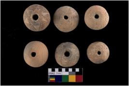| Description / विवरण | There are n-6 of beads. All are made up of Terracotta. All of them are intact. They vary in shape. Out of 6 beads, 1 is flat base sloping shoulders truncated top, 1 is globular and 4 are biconvex. |