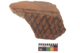 | Description / विवरण | Specimen of black on red ware with black decorative Lattice pattern geometric painting. |
