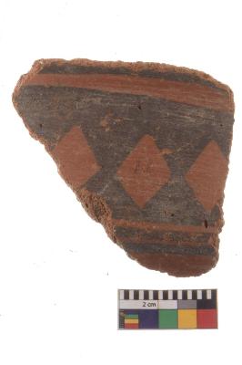 | Description / विवरण | Specimen of black on red ware with black decorative Joined filled cheques geometric painting. |