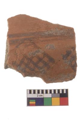 | Description / विवरण | Specimen of black on red ware with black decorative Joint lattice squares geometric painting. |