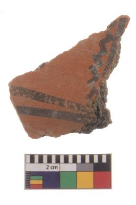 | Description / विवरण | Specimen of black on red ware with black decorative Wavy and parallel vertical lines geometric painting. |