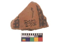 | Description / विवरण | Specimen of black on red ware with black decorative Parallel horizontal lattice geometric painting. |