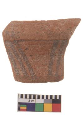 | Description / विवरण | Specimen of black on red ware with black decorative V shape pattern geometric painting. |