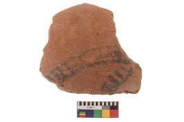 | Description / विवरण | Specimen of black on red ware with black decorative Curve joint with spike line geometric painting. |