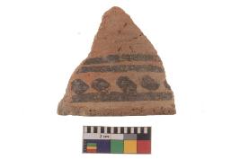 | Description / विवरण | Specimen of black on red ware with black decorative Circles between parallel lines geometric painting. |
