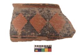 | Description / विवरण | Specimen of black on red ware with black decorative Cheques pattern geometric painting. |