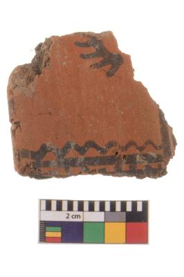 | Description / विवरण | Specimen of black on red ware with black decorative Wavy lines and sun motife nature and geometric painting. |