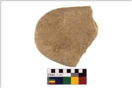| Description / विवरण | A partially broken specimen of oval shaped rubber stone. It is oval on plan with both side smooth surfaces and plano-convex section. It is having plano-convex section. It is made up of sandstone. |