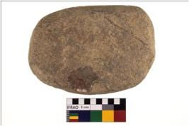| Description / विवरण | A complete specimen of oval shaped sharpner, somewhat flat, oval on plan with battered periphery along the ridges and with both the surfaces, thick and having a rectangular section. It is made up of red sandstone. |