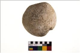 | Description / विवरण | A partially broken specimen of irregularly circular shaped hammerstone with battered periphery along the circumference. It is somewahat flat at one end. It is made up of sandstone. |