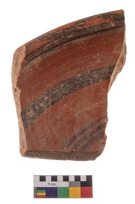 | Description / विवरण | Specimen of black on red ware with black decorative Joint curves on rim and parallel lines on the body geometric painting. |