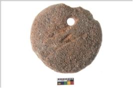 | Description / विवरण | A partially broken specimen of a large flat bead with a single perforation close to the edge. It is having rough surface and brownish-reddish in colour. The perforation is big on one surface whereas small on the other surface. The pendant is devoid of any kind of wash. |