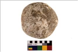 | Description / विवरण | A complete specimen of round shaped hammerstone with battered periphery along with the circumference. It is somewhat flat at one end. It is made up of quartz. |
