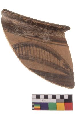 | Description / विवरण | Specimen of black on red ware with black decorative Leaf with parallel verticle lines geometric painting. |