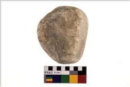 | Description / विवरण | A partially broken specimen of irregularly round shaped hammerstone with battered periphery along with the circumference. It is somewhat flat at one end. It is made up of quartz. |