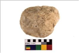 | Description / विवरण | A partially broken specimen of irregularly round shaped hammerstone with battered periphery along with the circumference. It is broken from the middle portion. It is made up of quartz. |