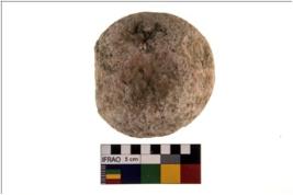 | Description / विवरण | A complete specimen of round shaped hammerstone with battered periphery along with the circumference. It is somewhat flat. It is made up of quartzite. |