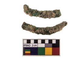 | Description / विवरण | A fragment of copper bangle, circular cross section and incrusted surface. |