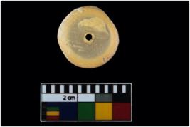 | Description / विवरण | A complete specimen of a convex truncated cone disc shaped bead with a circular section. It is having a tubular perforation. It is having a glossy, shiny and smooth surface. |